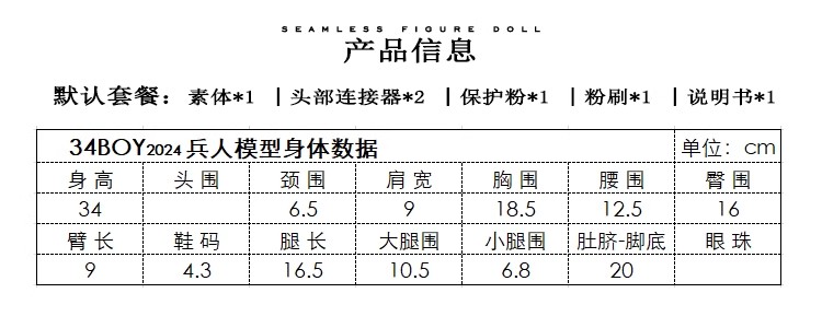 One-Sixth 34Boy素体介绍;身体喷绘妆面加$60,手指可动骨骼加$40
